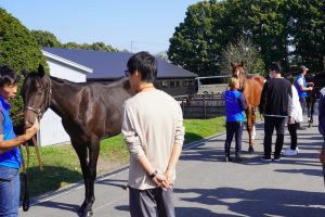 当日はお天気にも恵まれ、10月の北海道であるにもかかわらず、半袖一枚で過ごしておられる方もちらほら。募集馬見学日和となりました。