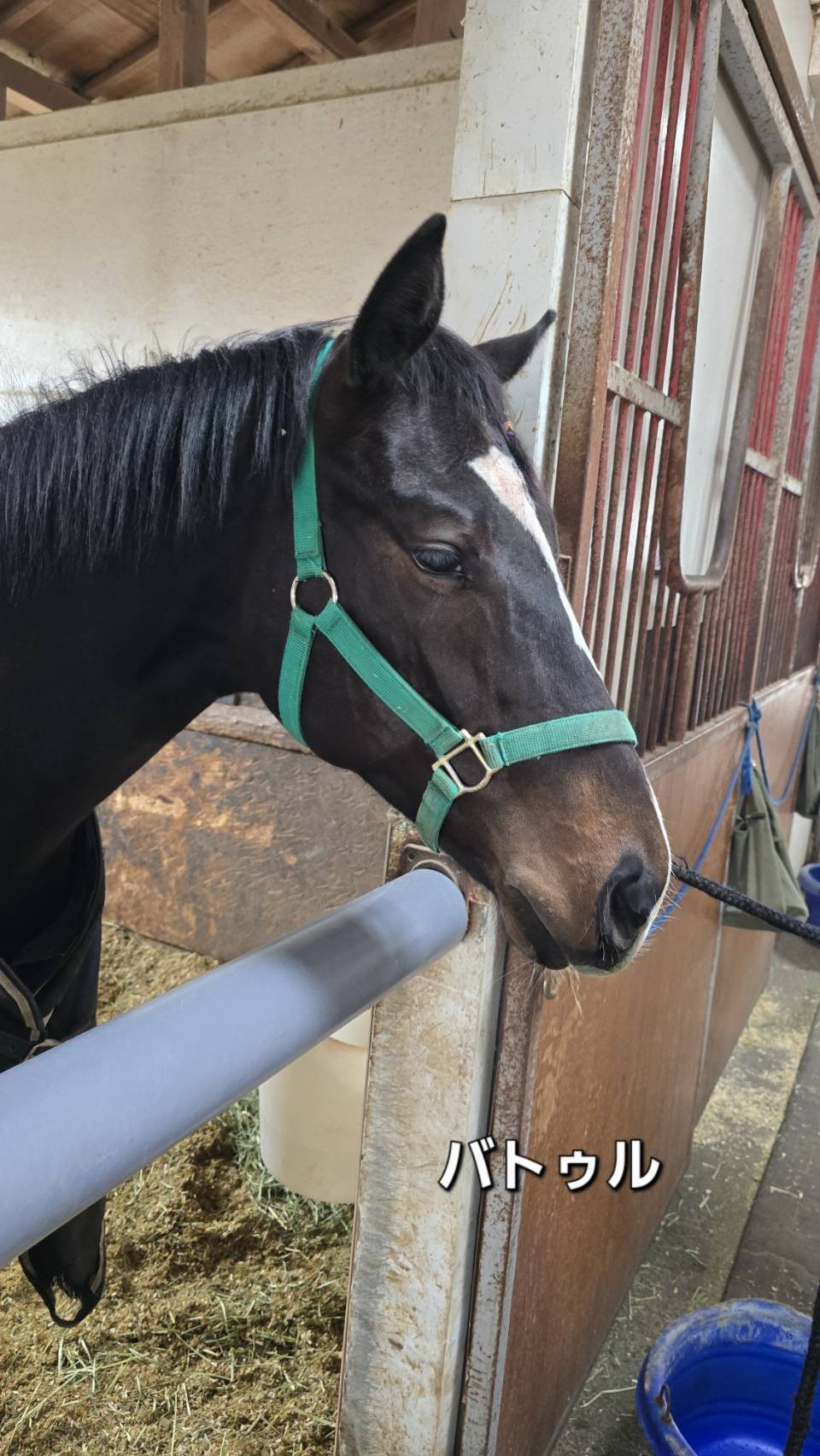 「中間まで順調にトレーニングしていましたが、先日の調教前にウォーキングマシンに入っていたところ、前に突進してしまい、額に外傷を負ってしまいました。傷が深かったため、すぐに縫合処置を行いました。幸い走りに影響はないものの、調教すると傷口が開いてしまいますので、今は運動を控えて、パドック放牧のみです。傷が治り次第調教は再開していく予定です。」(牧場関係者)