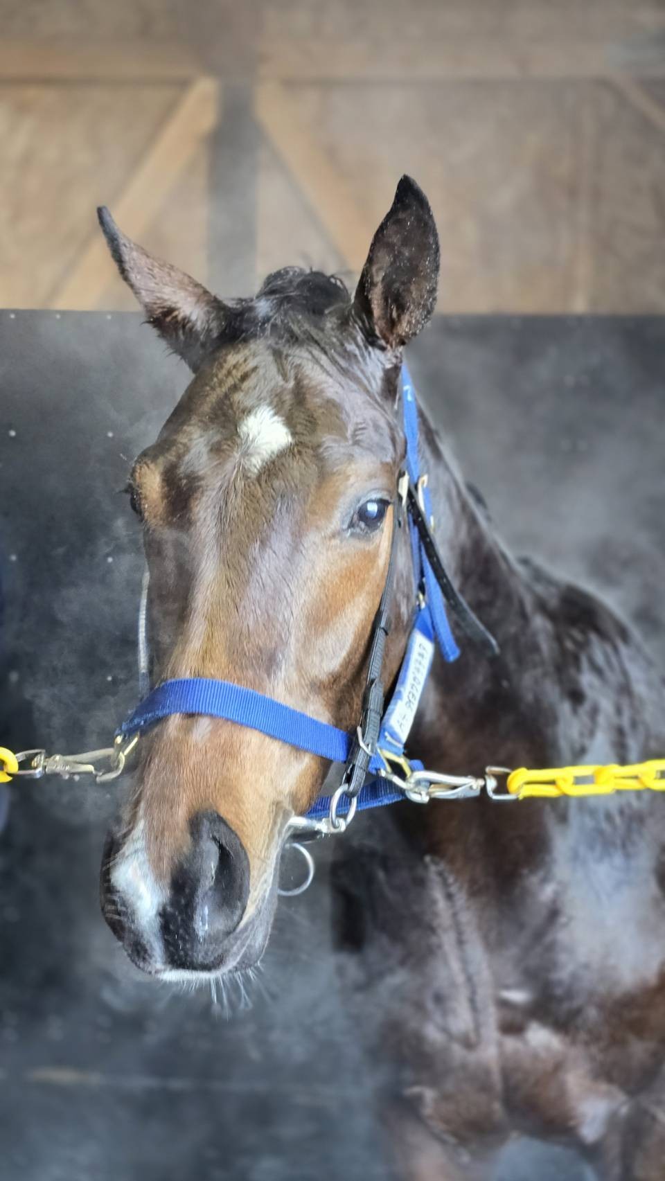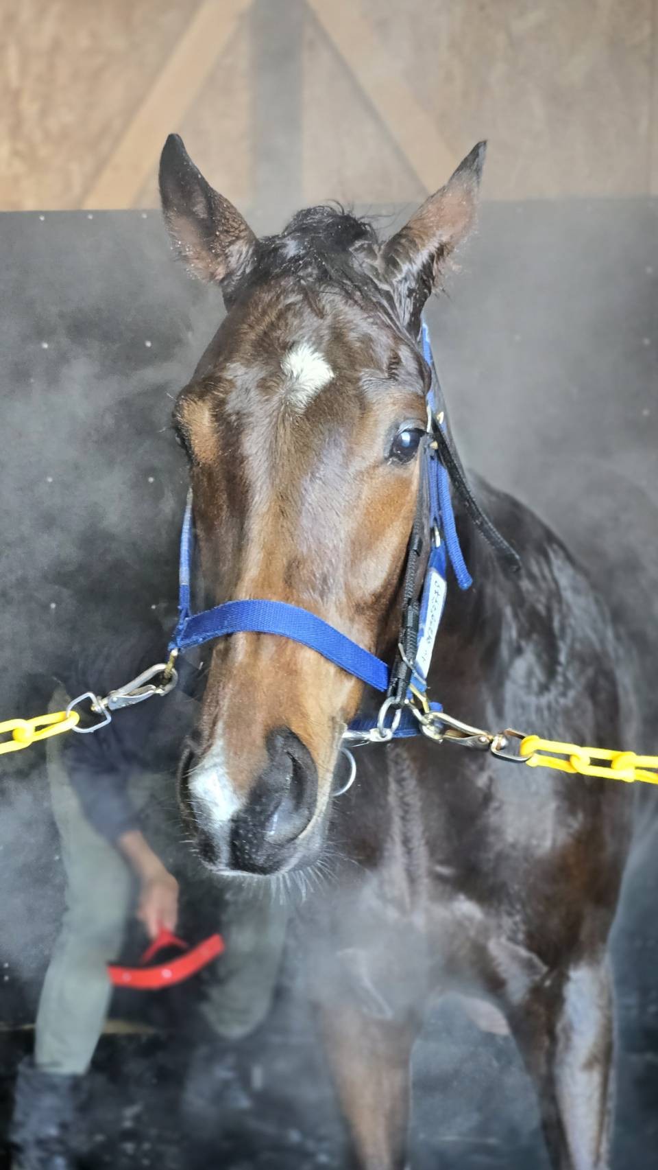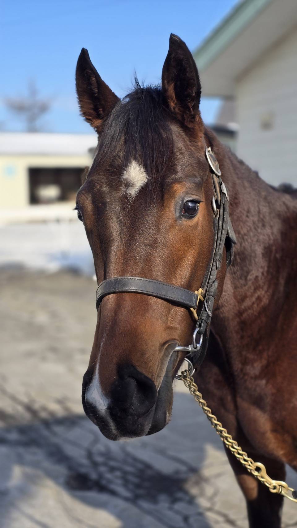 「引き続き順調に乗り込めています。今はトラックコースでじっくりと乗った後に坂路コースに入って、ラストを16秒台で駆け上がっています。運動量も順調に増やしていくことができていますし、ピッチも上げることが出来ています。オンとオフの切り替えも上手な方だと思います。普段は落ち着きがあり、調教になるとキリっとして、ちゃんとスイッチを入れてくれています。今後もしっかり強化していきたいと思います。」(牧場関係者)