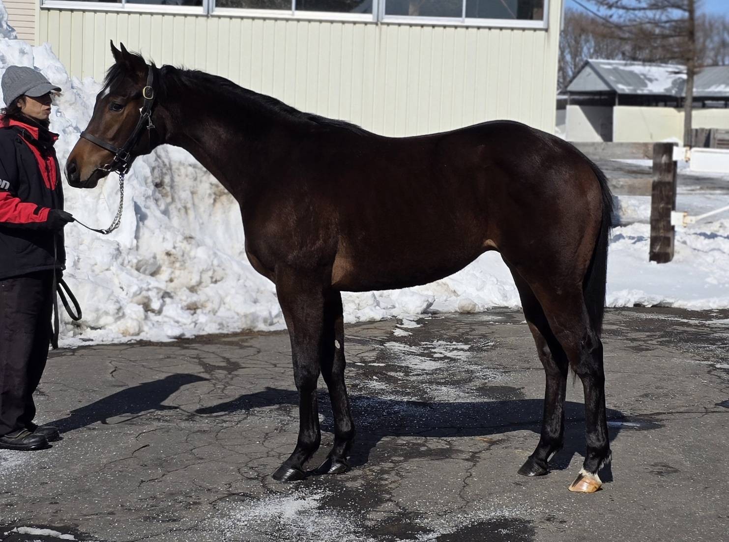 「大きな変化はありませんが、最近は坂路でのペースを少しずつ上げており、普段は17-16-16くらいで登って、週に1本は16-15-14のペースで登坂しています。トラックコースでダク、ハッキングを行っているときは少し幼い行動を見せていますが、坂路に入るとしっかりスイッチが入って、一生懸命走ってくれていますよ。いい意味で切り替えが出来ていると思います。まだ後肢の力が不足していますので、さらに強化していきながら進めていきたいと思います。」(牧場関係者)