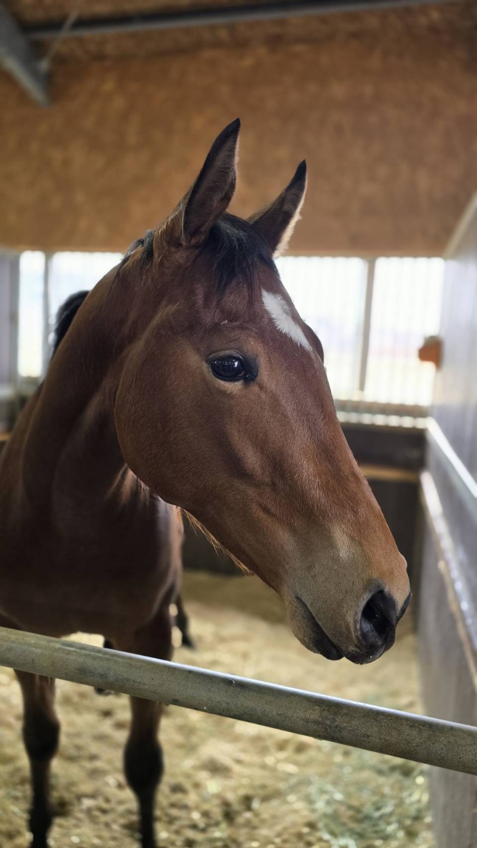 「本馬も毎日順調にトレーニング出来ています。調教メニューはこれまでと変わらず、今日(取材日)も角馬場と屋内コースでしっかり乗った後、坂路コースに入ってハロン18秒前後のペースで登坂しています。最近は少し気持ちが入り過ぎてしまい、行きたがる素振りを見せていましたので、ペースは上げず、少しでも我慢出来るように乗っています。基本的には短い距離のタイプだとは思いますが、折り合いがつけば距離の融通も利くと思いますので、色々と教えながら進めています。」(牧場関係者)