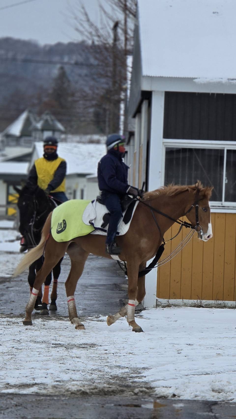 「本馬も軽い休養を取ったことで、疲れが抜けて良い状態で今年のスタートを切ることが出来ています。今日(取材日)は坂路コースを単走で3ハロン15秒中盤のペースで登坂しました。走りのリズムも良かったですし、単走でもすごく集中出来ていましたね。どちらかといえば時間をかけた方がいいタイプだと思いますが、ここまでは順調に進められていますね。今後も調教内容を少しずつ変化させながら経験を積んで、少しでもレベルアップが図れるよう乗り込んでいきます。」(牧場関係者)