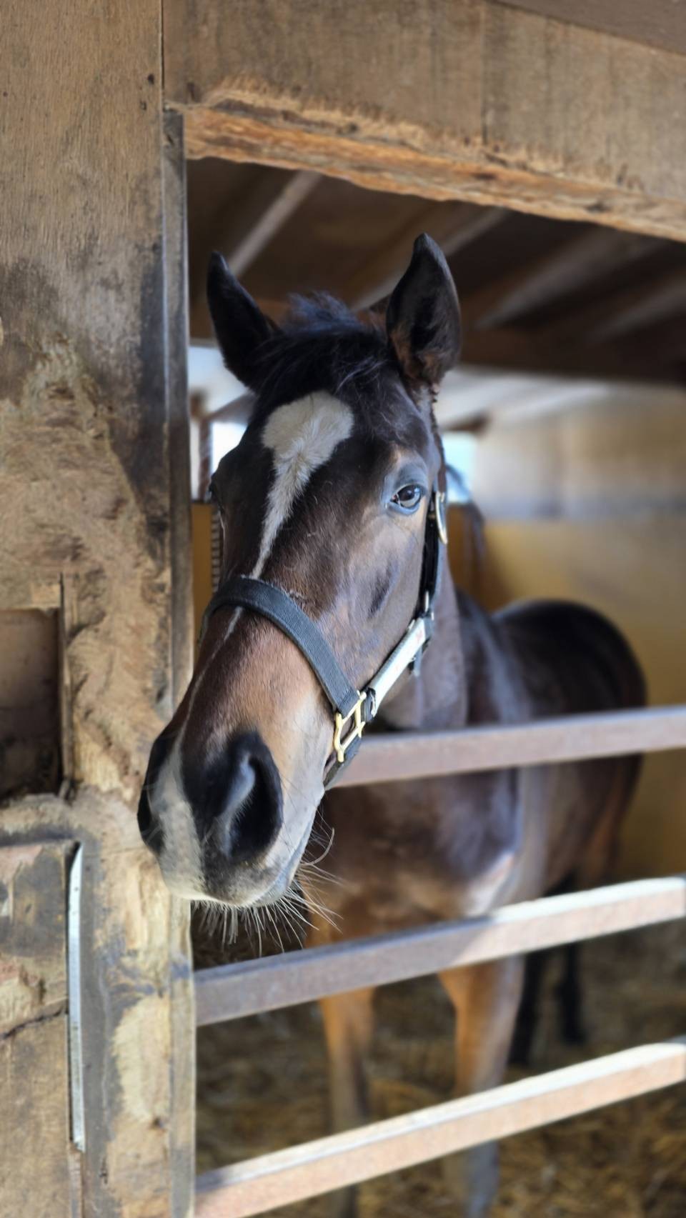 「本馬もここまで順調に進めることが出来ましたので、昨日(取材前日)BTCの坂路コースに初めて入りました。ヤンチャタイプでしたが、環境が変わったことで少し怯んだのか、いつもより大人しかったですね。そのおかげで思っていた以上に真面目に登坂してくれました。多少、馬自身に不安もあったと思うので乗り役の指示に従ってくれましたね。走りも悪くなかったですし、真面目に走ることが出来ればいいモノは持っていると思います。」(牧場関係者)