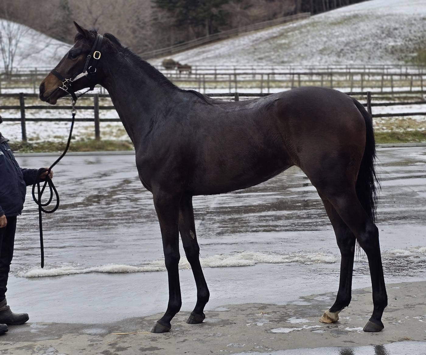 「今のところ順調に乗り込めていますね。調教も今までと同じく、牧場内の500mトラックコースで2500m~3000mほど乗っています。ここまでしっかり躾けしてきたことで、だいぶ良くはなってきていますが、騎乗者が変わるとまだ反抗しようとするところがありますね。走り出してしまえばある程度真面目に走ってはくれていますので、そこまでの過程をしっかり教育していきたいと思います。あとはもう少し馬体重が増えてくれると良いですね。」(牧場関係者)