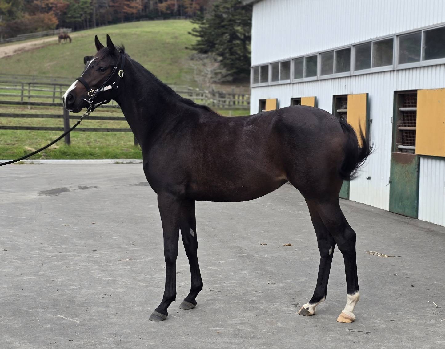 「入場してきた頃に比べると環境に慣れたこともあり、少しは落ち着いてきましたが、性格的にはピリピリしているタイプですね。馴致の時も色々なものに気を取られて、なかなか集中出来ていませんでしたが、時間をかけながら進めることで、今は乗り慣らしまで進めることが出来ています。先日整歯を行いましたので、この一週間は楽をさせていますが、本馬自身はすごく元気がありますね。調教が進むにつれて気持ちが張り詰めてしまうタイプかもしれないので、その辺は気を付けながら成長させていきたいと思います。」(牧場関係者)